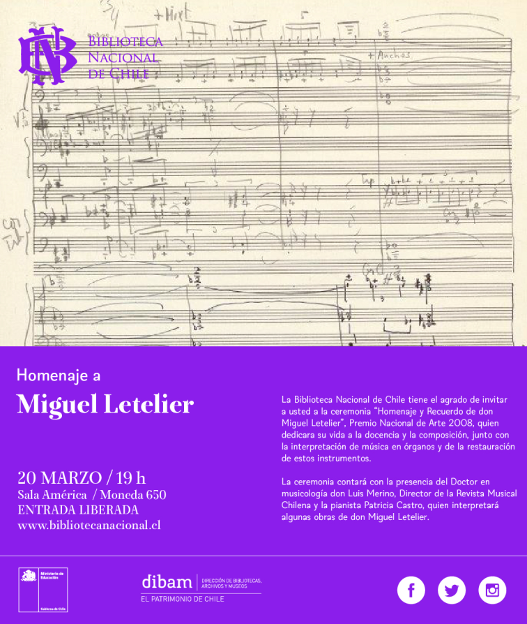 La Biblioteca Nacional de Chile tiene el agrado de invitar a usted a la ceremonia "Homenaje y Recuerdo de don Miguel Letelier", Premio Nacional de Arte 2008, quien dedicara su vida a la docencia y la composición, junto con la interpretación de música en órganos y de la restauración de estos instrumentos.