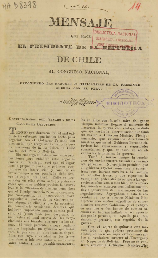 Mensaje que hace el presidente de la República al Congreso Nacional: exponiendo las razones justificativas de la presente guerra con el Perú, de José Joaquín Prieto (1836)