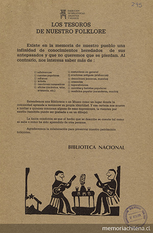 Memoria Chilena presenta un nuevo minisitio,"Estudios de folclor, cultura popular y patrimonio cultural inmaterial (1909-2003)" , realizado en colaboración con el Archivo de Literatura Oral y Tradiciones Populares de la Biblioteca Nacional de Chile (ALOTP), con motivo de sus 25 años de funcionamiento.