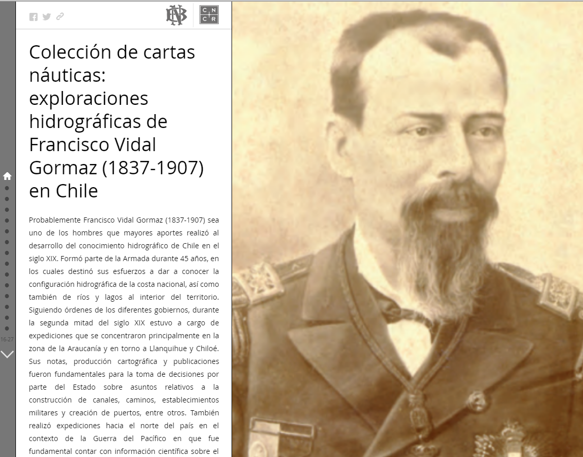 Durante 45 años, Francisco Vidal Gormaz (1837-1907) contribuyó a la formación de la nación a través del desarrollo del conocimiento en la hidrografía, meteorología, geografía, astronomía y topografía de un territorio hasta entonces inexplorado de Chile. 23 de sus cartas náuticas de la costa del norte y centro del país, así como de ríos y lagos de las zonas de la Araucanía, Llanquihue y Chiloé, acaban de ser georreferenciadas y publicadas como cartografía interactiva dentro de la aplicación de Mapas Patrimoniales de la Biblioteca Nacional Digital, desarrollada por la Biblioteca Nacional de Chile junto a la Unidad de Geoinformación del Patrimonio del Centro Nacional de Conservación y Restauración (CNCR).