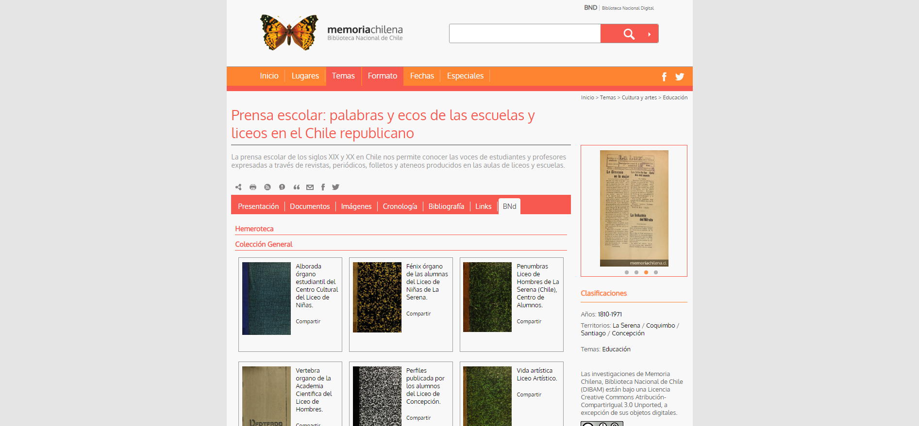 La segunda modificación afecta a Memoria Chilena y apunta a hacer más accesible, desde los minisitios, los objetos digitales de la BNd que puedan servir de material complementario. Si bien cada minisitio está construido a partir de una selección de objetos y una bibliografía específica, un botón en el menú de navegación permitirá acceder a digitalizaciones asociadas, como por ejemplo, colecciones de revistas y periódicos que existen completos en la Biblioteca Nacional Digital. Por el momento, una versión de prueba está disponible en el minisitio Prensa escolar: palabras y ecos de las escuelas y liceos en el Chile republicano.