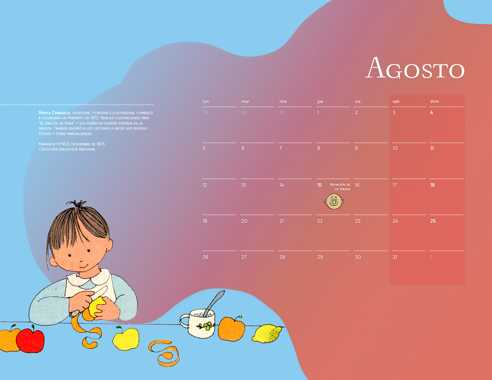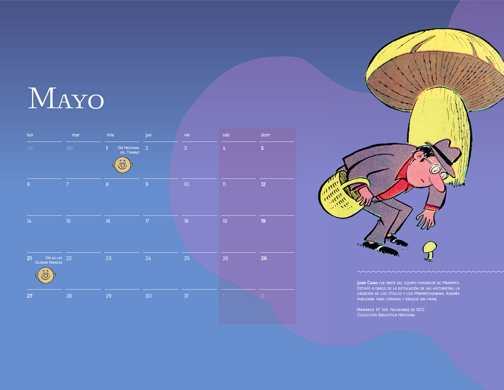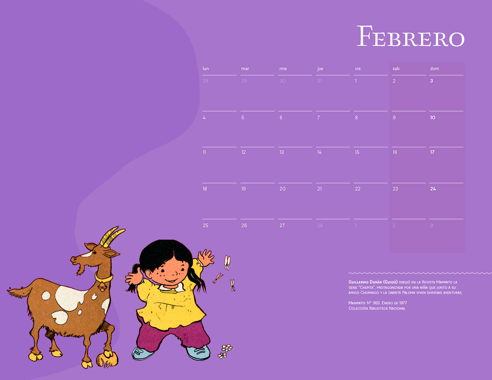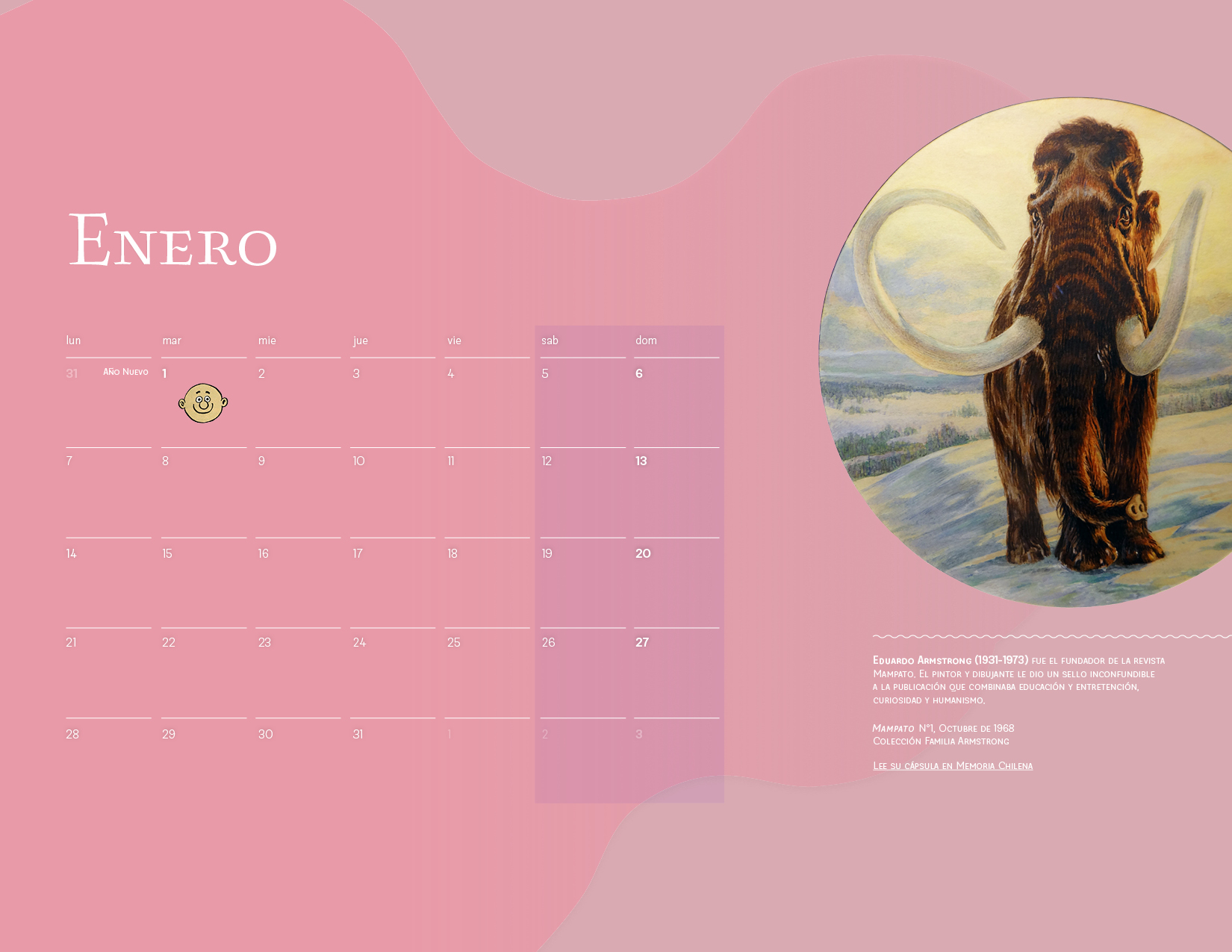 Este calendario fue realizado en colaboración con el Archivo de Láminas y Estampas, en el contexto de la exhibición Universo Mampato, que se presenta en la Galería de Cristal de la Biblioteca Nacional de Chile hasta la primera semana de marzo de 2019.