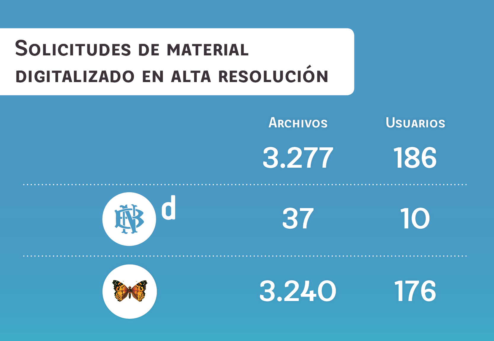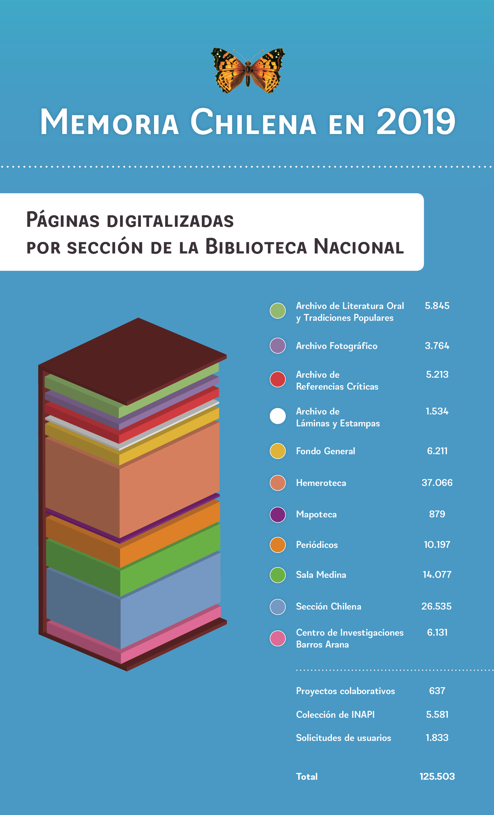 En total, 74.389 páginas fueron digitalizadas durante el año, pertenecientes a secciones de la Biblioteca Nacional como el Archivo de Literatura Oral y Tradiciones Populares, el Archivo Fotográfico, el Archivo de Referencias Críticas, el Archivo de Láminas y Estampas, Fondo General, Hemeroteca, Mapoteca, Periódicos, Sala Medina, Sección Chilena y Centro de Investigaciones Barros Arana. Esas páginas se encuentran disponibles online en 25.066 objetos (23.586 registros) que ya están publicados en la Biblioteca Nacional Digital.