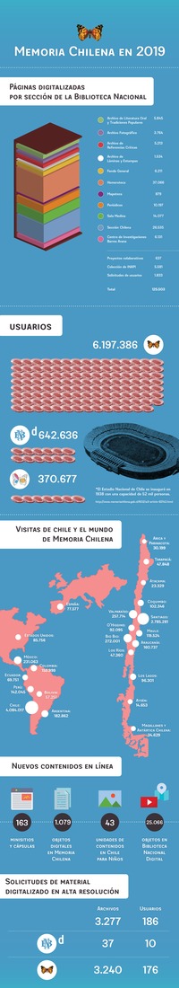 Fue un año ocupado para Memoria Chilena, Chile para Niños y Biblioteca Nacional Digital. 7.195.991 usuarios visitaron nuestros sitios web y, a lo largo del año, descargaron 1.040.787 archivos. Esa alta demanda se sumó a una nutrida programación de actualizaciones y nuevos contenidos, que fueron publicados a lo largo de 2019, y un intenso trabajo interno de digitalización e investigaciones para futuras publicaciones.