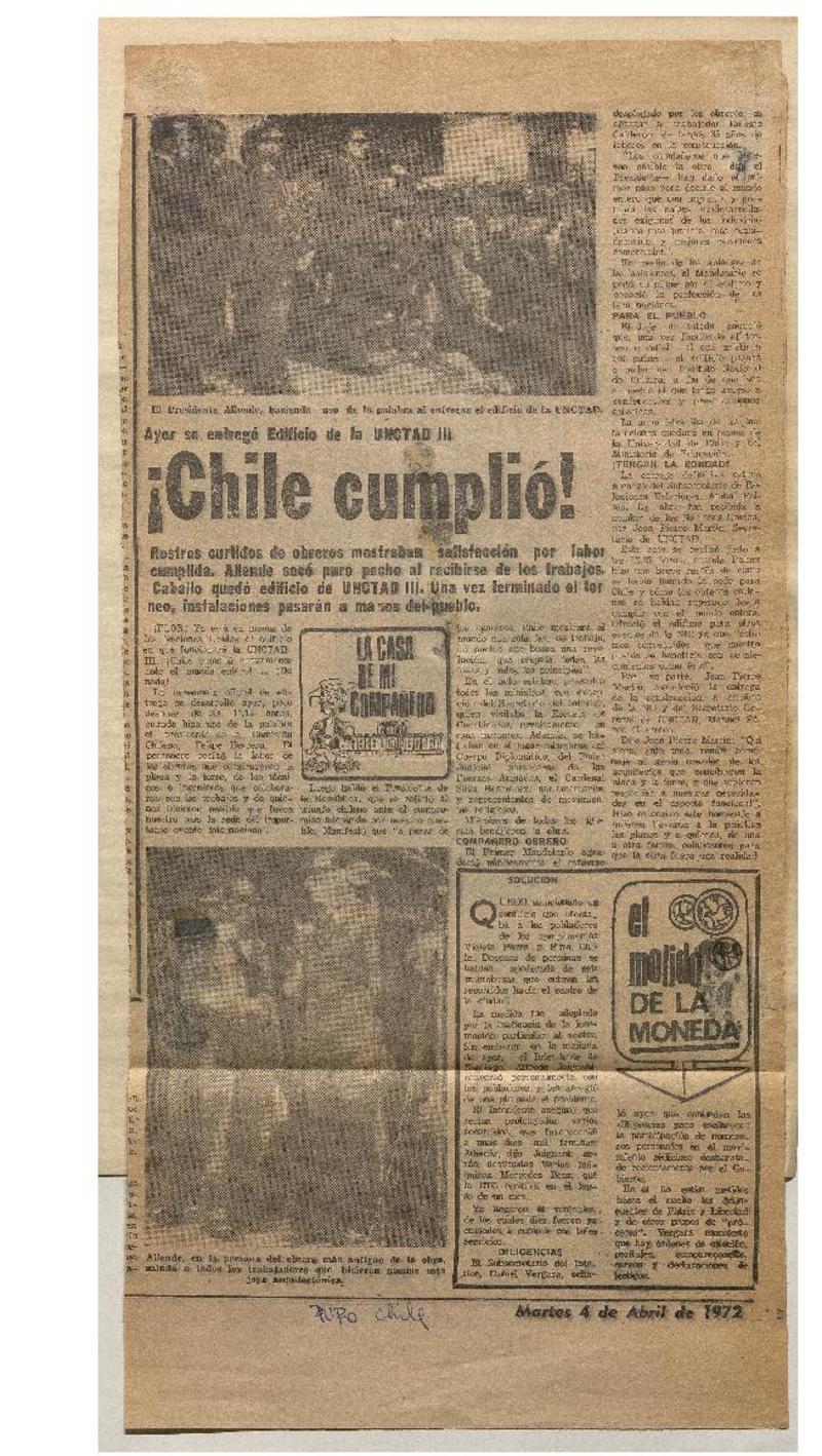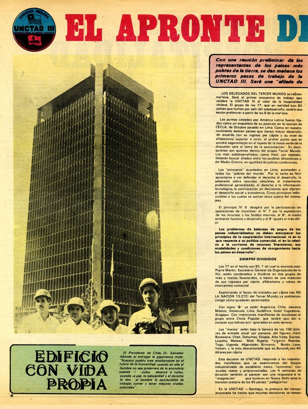 "Esto es obra del empuje y esfuerzo de todo el pueblo" dijo Allende en acto de entrega de edificio UNCTAD a la ONU. [artículo] :