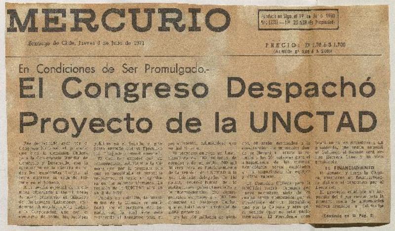 El Congreso despachó proyecto de la UNCTAD en condiciones de ser promulgado. [artículo] :