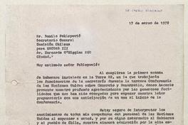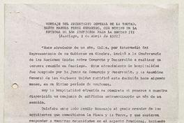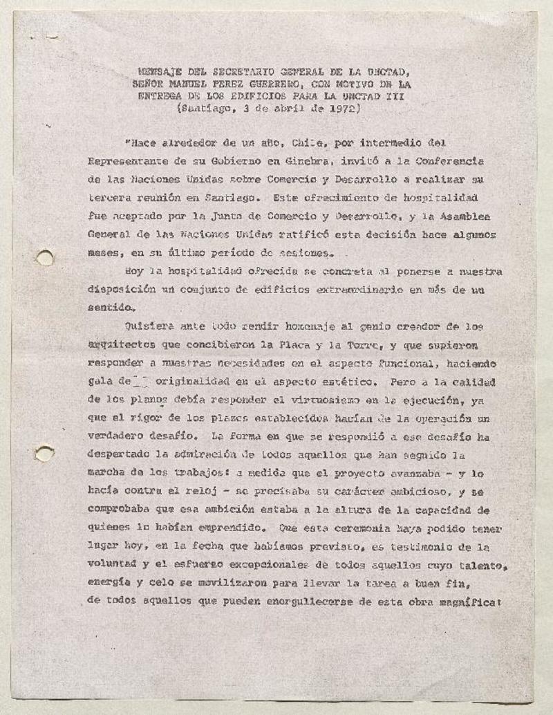 Mensaje del Secretario General de la UNCTAD, señor Manuel Pérez Guerrero, con motivo de la entrega de los edificios para la UNCTAD III (Santiago, 3 de abril de 1972). [manuscrito] :
