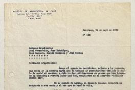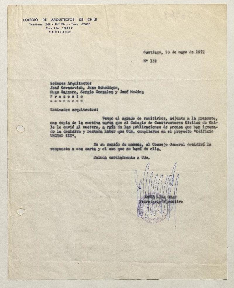 [Carta] 1972, mayo 23 de Santiago, Chile [a] señores arquitectos José Covacevich, Juan Echeñique, Hugo Gaggero, Sergio González y José Medina [manuscrito] Jorge Lira Graf.
