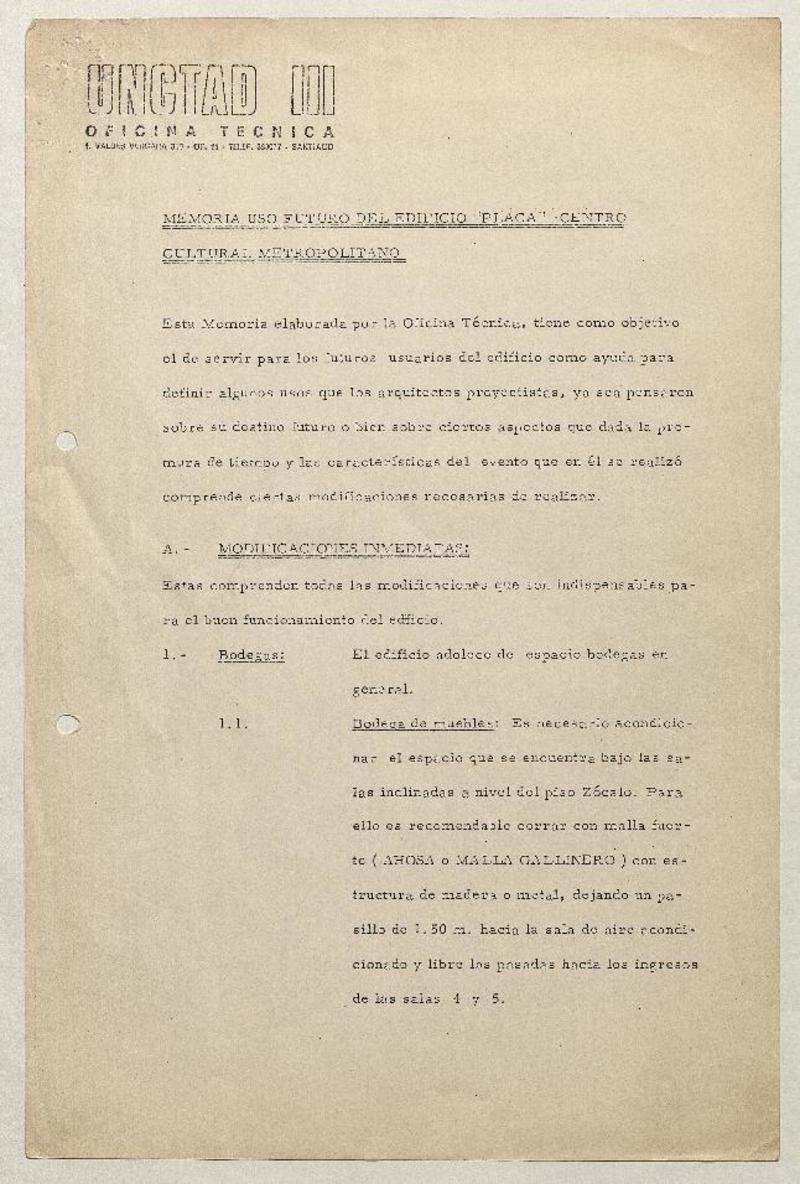 Memoria uso futuro del edificio "placa" - Centro Cultural Metropolitano [manuscrito] José Medina R., arquitecto y Hugo Gaggero C., arquitecto.