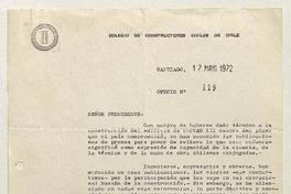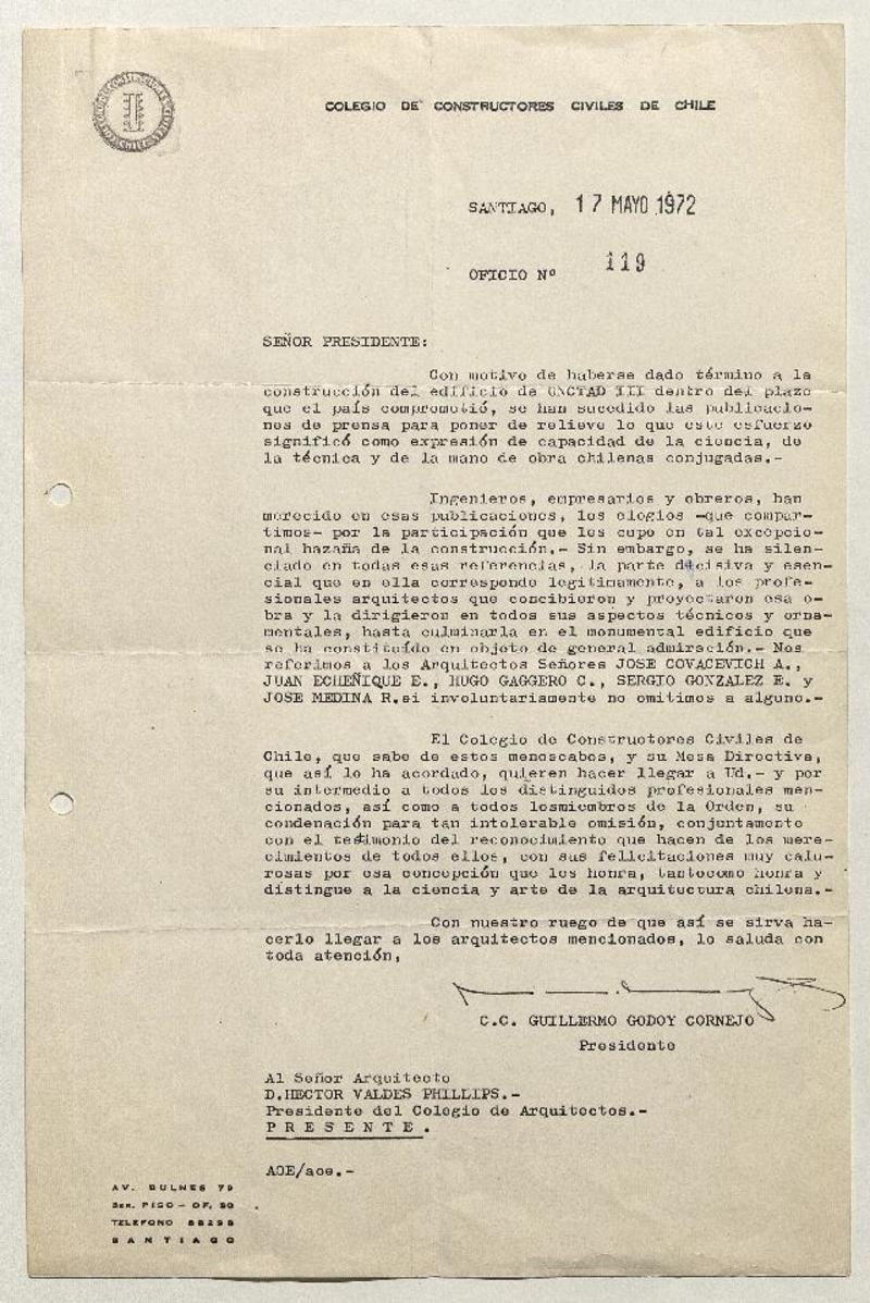 [Carta] Guillermo Godoy Cornejo, 1972 mayo 17, Santiago, Chile [a] D. Héctor Valdés Phillips, presidente del Colecio de Arquitectos [manuscrito] Guillermo Godoy Cornejo.