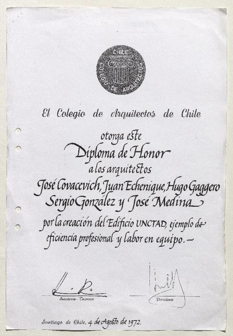 El Colegio de Arquitectos de Chile otorga este diploma a los arquitectos José Covacevich, Juan Echeñique, Hugo Gaggero, Sergio González y José Medina por la creación del Edificio UNCTAD, ejemplo de eficiencia profesional y labor en equipo [manuscrito]