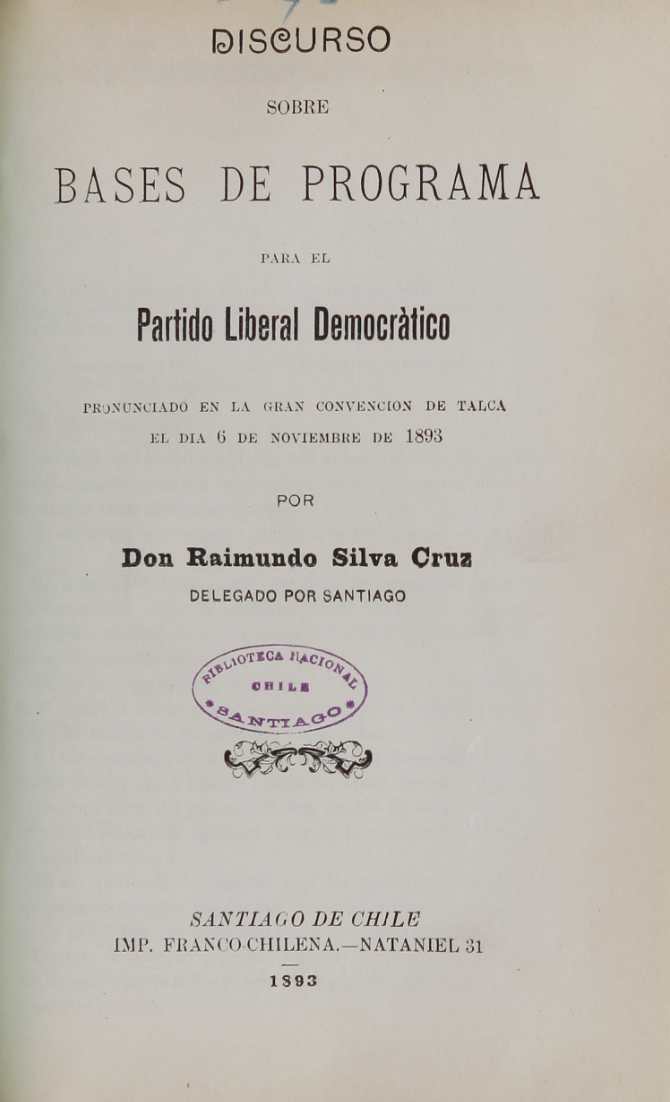 Discurso sobre bases de programa para el Partido Liberal Democrático pronunciado en la Convención de Talca (Libro) / Raimundo Silva Cruz, 1893