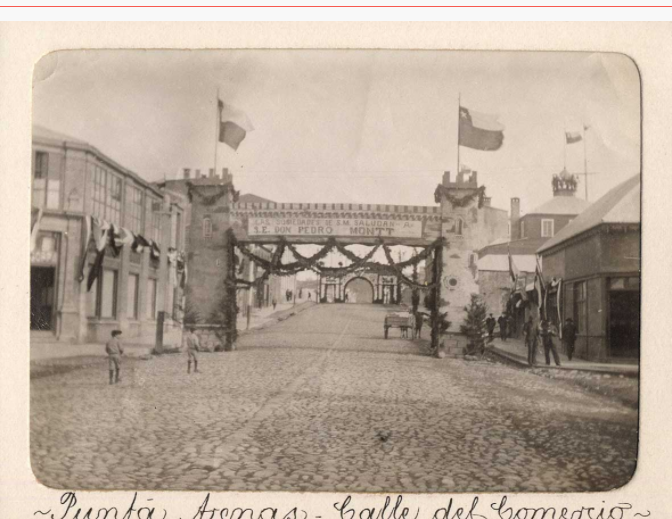 Calle del Comercio en Punta Arenas, adornada para festejar la visita del presidente Pedro Montt, 1907 (Fotografía) / Ricardo Jiménez, 1907