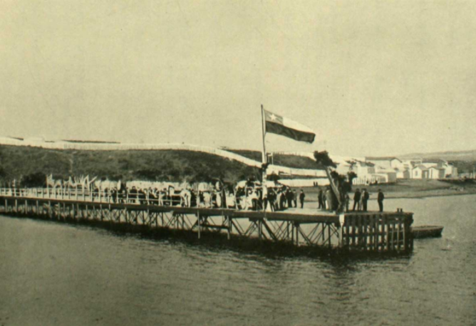 Muelle de Porvenir, Tierra del Fuego, 1906 (Lámina) / Lautaro Navarro Avaria. Censo jeneral de población i edificación, industria, ganadería i minería del territorio de Magallanes República de Chile : levantado por acuerdo de la comisión de alcades el día 8 de setiembre de 1906, pasado y presente del territorio de Magallanes, 1907-1908.