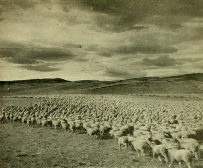 Ovejas secándose tras el baño, en una estancia de Magallanes, hacia 1940 (Lámina) / Sociedad Explotadora de Tierra del Fuego / monografía por Fernando Durán, 1940