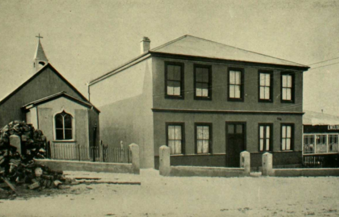 Iglesia anglicana y Escuela Inglesa, Punta Arenas, 1906 (Lámina) / Lautaro Navarro Avaria. Censo jeneral de población i edificación, industria, ganadería i minería del territorio de Magallanes República de Chile : levantado por acuerdo de la comisión de alcades el día 8 de setiembre de 1906, pasado y presente del territorio de Magallanes, 1907-1908.