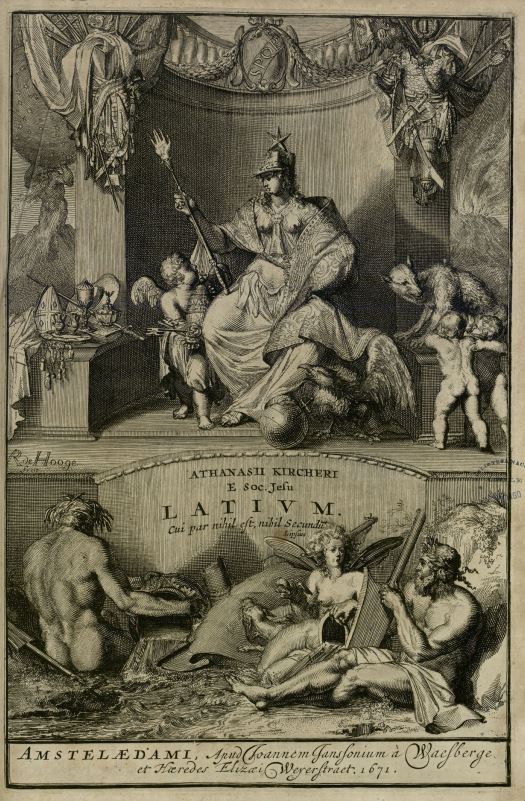 - Latium, id est, Nova & parallela latii tum veteris tum novi descriptio : qua quæcunque vel natura, vel veterum Romanorum ingenium admiranda efficit, Geographico-Historico-Physico ratiocinio, juxta rerum gestarum temporumque seriem exponitur et enucleatur / Athanasii Kircheri. Amstelodami : Apud Joannem Janssonium à Waesberge & Hæredes Elizei Weyerstraet, 1671.