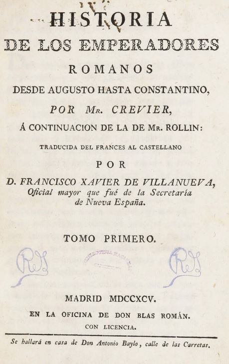 - Historia de los emperadores romanos desde Augusto hasta Constantino / Por M. Crevier, a continuacion de la de Mr. Rollin ; traducida del frances al castellano por D. Francisco Xavier de Villanueva. Madrid : En la Oficina de Don Blas Roman, 1795-1797.