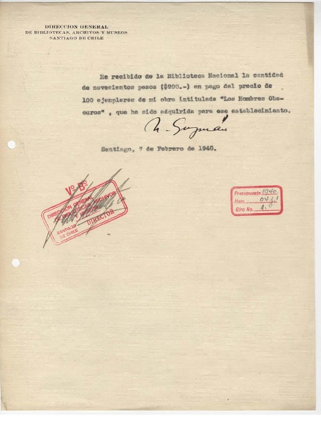 [Recibo] 1940 feb. 7, Santiago, Chile [a] Biblioteca Nacional de Chile [manuscrito] Nicomedes Guzmán.