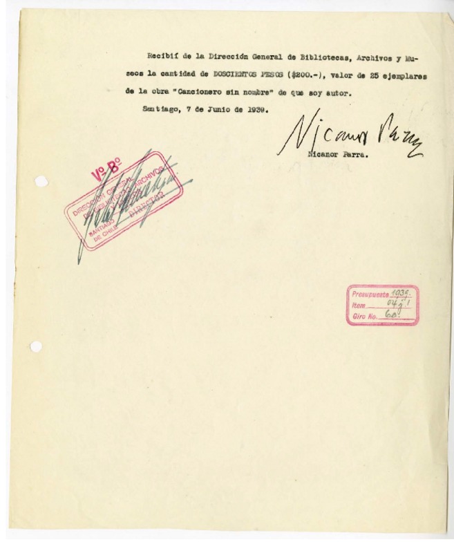 [Recibo] 1939 junio 7, Santiago, Chile [a] Biblioteca Nacional de Chile [manuscrito] Nicanor Parra.