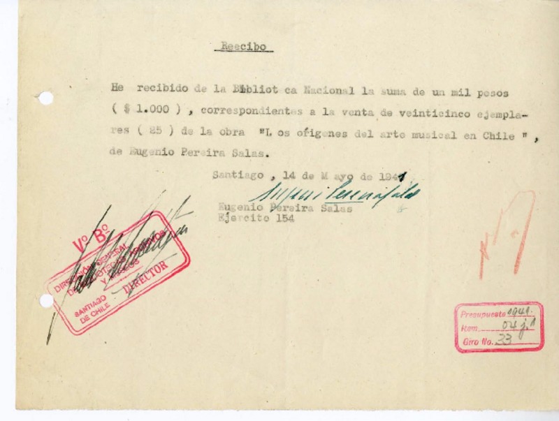[Recibo] 1941 septiembre 9, Santiago, Chile [de] Biblioteca Nacional de Chile [manuscrito] Luis Oyarzún.