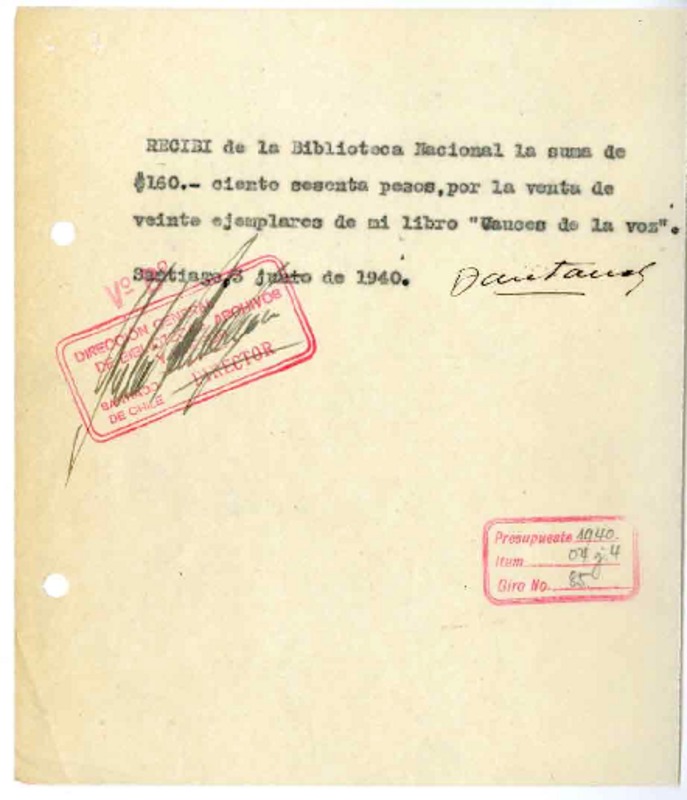 [Recibo] 1940 may. 15, Santiago, Chile [a] Biblioteca Nacional [manuscrito] Fernando Alegría.