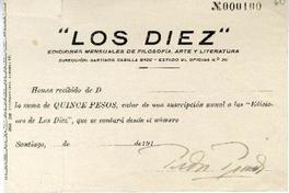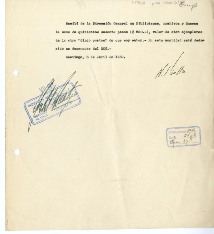 [Recibo] 1939 abril 3, Santiago, Chile [a] Biblioteca Nacional de Chile [manuscrito] Norberto Pinilla.