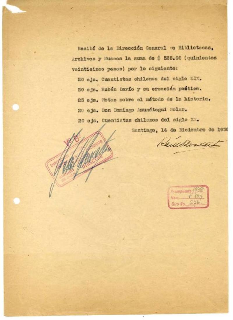 Santiago, Chile [a] Biblioteca Nacional de Chile Recibo, 1938 diciembre 14, [manuscrito] Raúl Silva Castro.