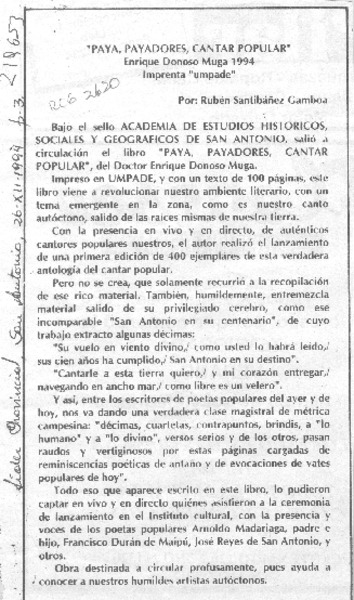 "Paya, payadores, cantar popular" [artículo] Rubén Santibáñez Gamboa.