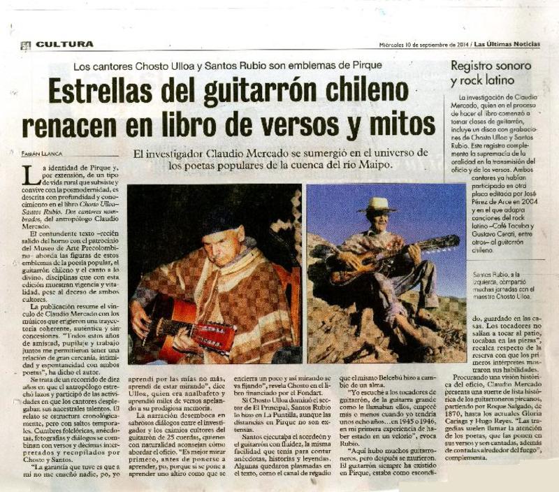 Estrellas del guitarrón chileno renacen en libro de versos y mitos [artículo] Fabián Llanca.
