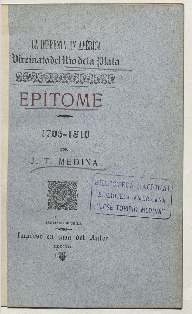 La imprenta en América, Virreinato del Río de la Plata : epítome, 1705-1810 / por J. T. Medina. Santiago de Chile : Impreso en Casa del Autor, 1890. viii, 51 páginas.