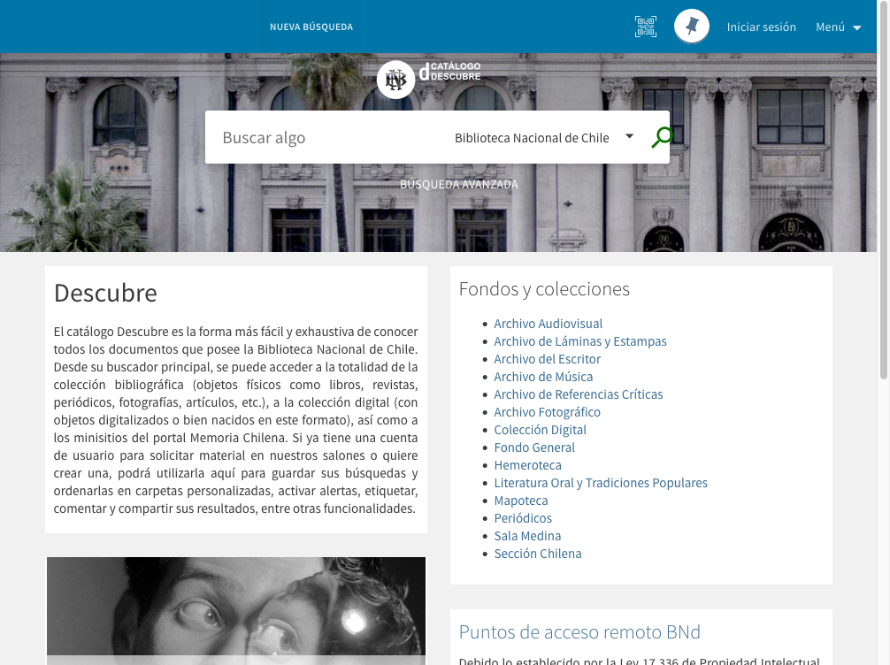Desde la creación de la Biblioteca Nacional Digital, en 2013, el Catálogo Descubre ha sido una herramienta imprescindible para los usuarios de la plataforma web. Es la forma más fácil y exhaustiva de conocer todos los documentos que posee la Biblioteca Nacional de Chile, pues reúne información desde tres fuentes de datos: la colección bibliográfica (objetos físicos como libros, revistas, periódicos, fotografías, artículos, etc.), la colección digital (objetos digitalizados o nacidos en formato digital) y los minisitios de Memoria Chilena. De esta manera, su buscador tiene un alcance mayor al catálogo Aleph de la Biblioteca Nacional -que no incluye minisitios- y los buscadores de BN digital y Memoria Chilena, que exploran solamente lo que se ofrece cada sitio web.