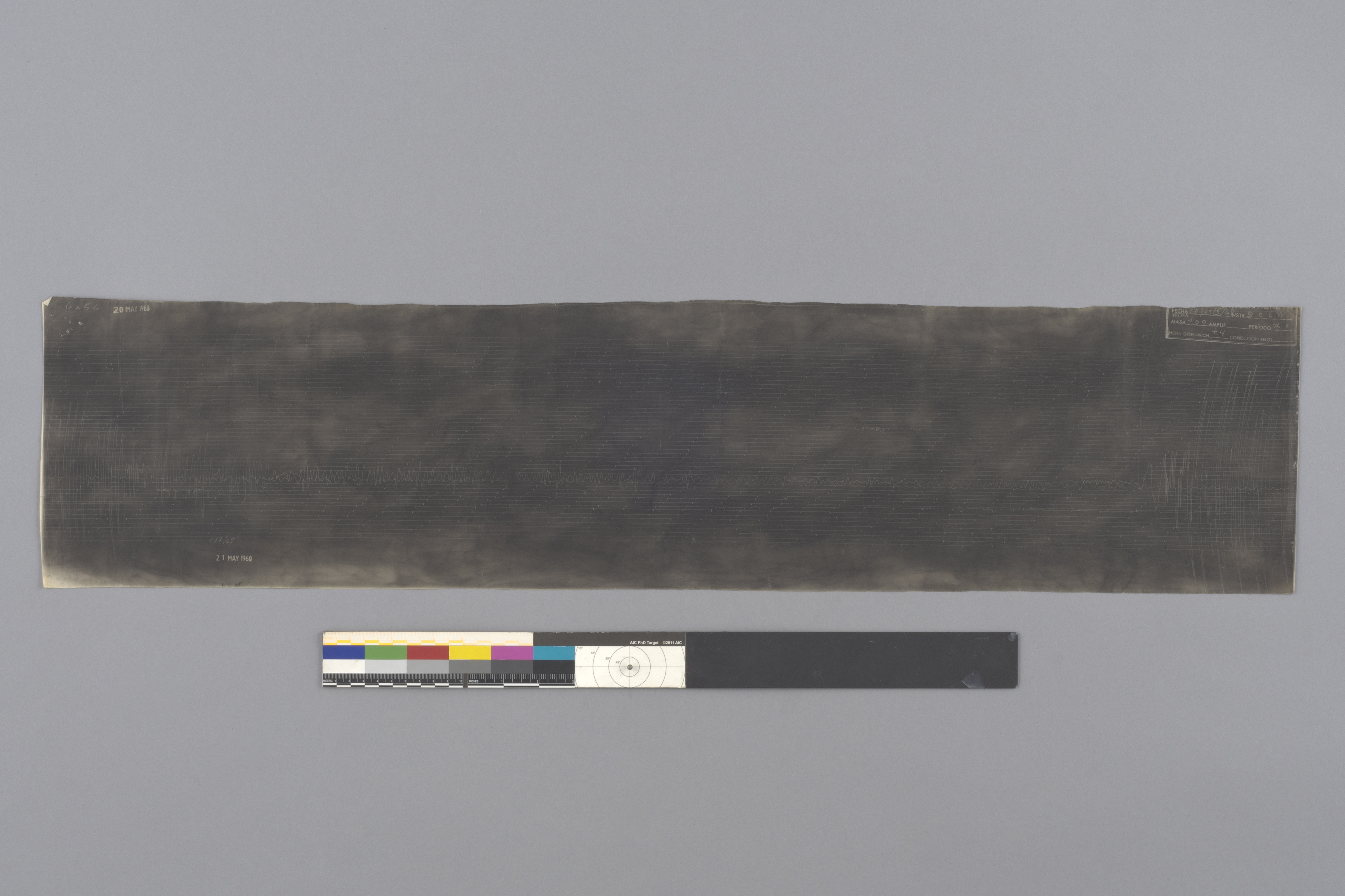 Entre enero y abril de 2022, el Laboratorio de Digitalización de la Biblioteca Nacional realizó la captura de los documentos con la máquina Suprascan. Este dispositivo permite escanear documentos de gran formato, como mapas, planos, periódicos y, en este caso, sismogramas de Valdivia 1960. Sin embargo, el grosor del papel ahumado determinó que no fuera posible estirar los documentos usando la función de succión de la Suprascan. Una de las mayores complejidades de la digitalización fue, entonces, evitar cambios en la luminosidad del documento, debido a las ondulaciones del papel.