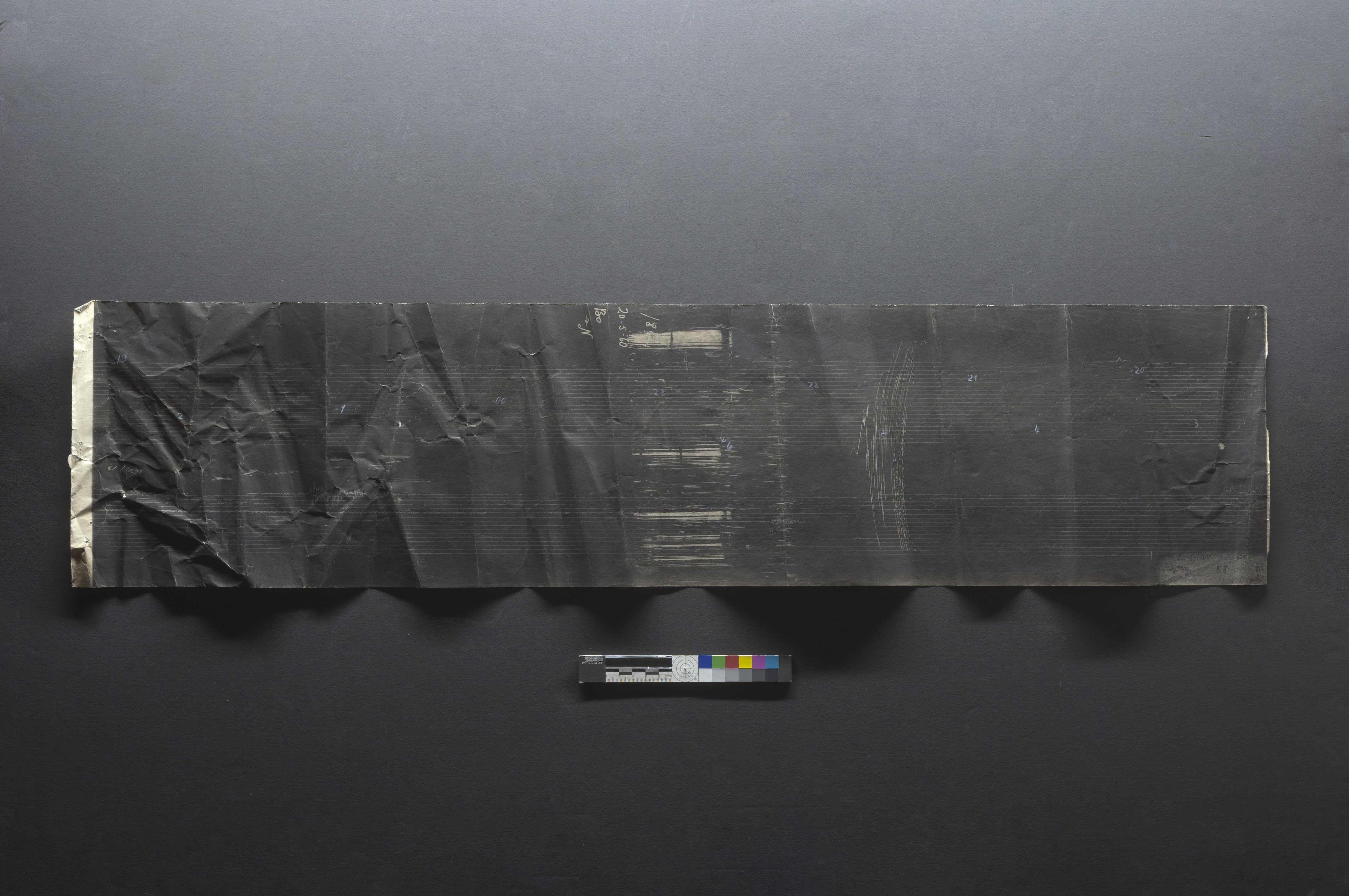 Anverso inicial general con luz rasante desde borde superior del Sismograma UPGD-2021.001.18, perteneciente al Centro Sismológico Nacional de la Universidad de Chile. Crédito: