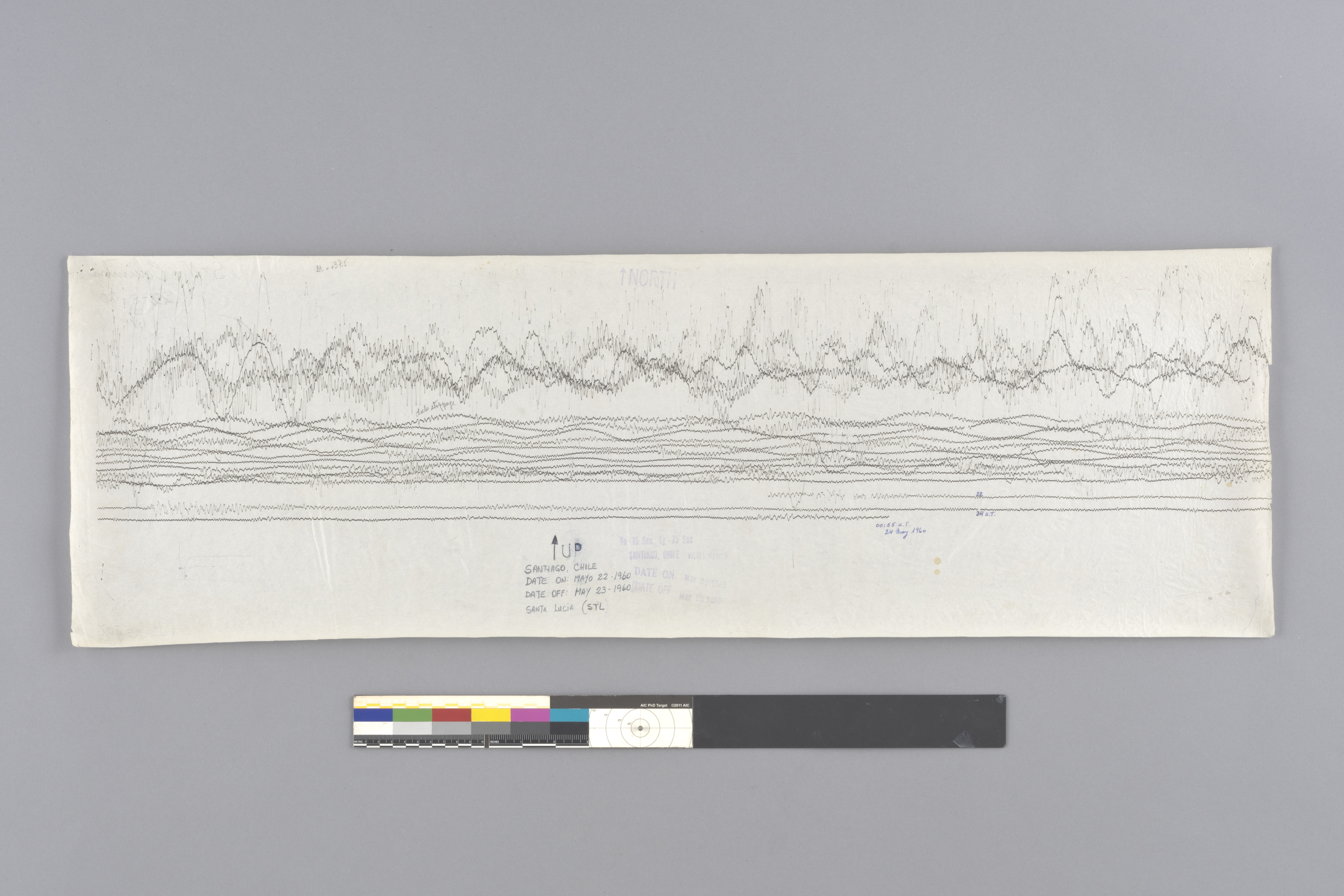 Estos sismogramas permiten apreciar la manera de registrar que tenían los primeros sismógrafos. En particular, estos registros fueron obtenidos desde una bóveda en el cerro Santa Lucía habilitada en 1908 para alojar los instrumentos sismológicos que, en ese momento, disponía el Servicio Sismológico Nacional. Fue la primera estación sismológica de primer orden instalada en Chile. En ella, los registros se grabaron sobre papel, usando dos técnicas: uno, la técnica de ahumado, en donde se realizaba en forma artesanal el ahumado de un papel y luego una aguja marcaba -retirando una fina capa de negro de humo- el movimiento relativo de la tierra; el segundo es un proceso fotográfico, donde el registro lo realiza la luz sobre el papel sensibilizado. Los registros permiten ver el cambio desde un estado relativamente quieto hasta uno convulsionado por el paso de las diferentes ondas sísmicas.