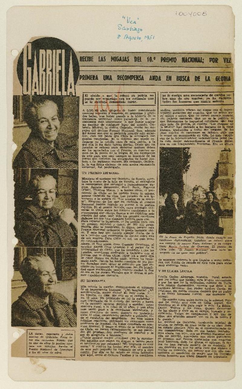 Gabriela recibe las migajas del 10.o Premio Nacional por vez primera una recompensa anda en busca de la gloria / [artículo] : Vea (Revista : Santiago, Chile)-- ago. 8, 1951, p. s/n. . Nos visita Gabriela Mistral, la insigne poetisa chilena [entrevista]. [artículo] : El Pueblo (Diario : Montevideo,Uruguay)-- ene. 12, 1938, p. s/n. .