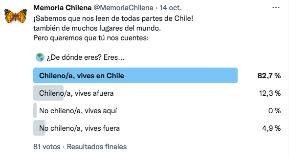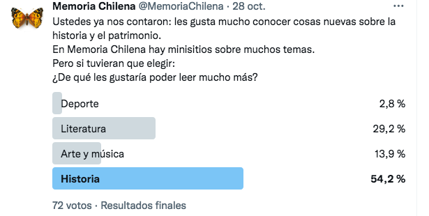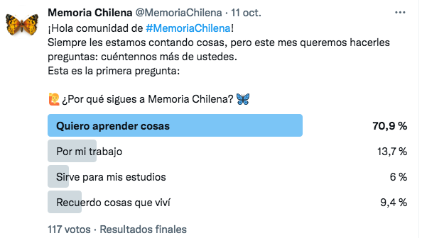 En el contexto del aniversario 19º de Memoria Chilena, quisimos poner la atención en esas personas que siguen los contenidos que cada día difundimos por redes sociales, bajo la hipotesis de que no son las mismas personas que visitan nuestro sitio web. Durante el mes de octubre, dos veces a la semana, lanzamos preguntas en formato de encuesta por nuestras redes -que también podían ser respondidas de forma abierta y espontánea- para conocer las opiniones de nuestros seguidores y seguidoras. Sin intenciones estadísticas, estas preguntas tuvieron la intención de fomentar la participación e interacción en las redes sociales y recabar información de manera lúdica sobre nuestros seguidores y nuestras seguidoras.