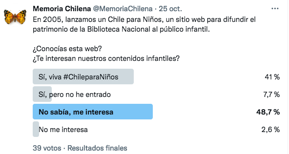 El 25 de octubre, preguntamos a seguidores y seguidoras si conocían el Chile para Niños, el sitio web que difunde las colecciones de la Biblioteca Nacional a través de contenidos creados especialmente para niñas y niños. Un 48,7% dijo no conocer la web, pero estar interesado; mientras que un 41% sí lo conocía. Un 7,7% dijo conocer de su existencia, pero no haberlo visitado nunca. Solo un 2,6% no estaba interesado en los contenidos para público infantil.