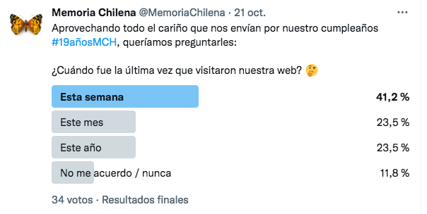 El 21 de octubre, la consulta fue: ¿cuándo fue la última vez que visitaron nuestra web? 41,2% de quienes respondieron en Twitter aseguraron que habían visitado www.memoriachilena.cl esa misma semana. Un 23,5% dijo haber visitado la web dentro de ese mes, y otro 23,5% durante este año. Un 11,8% no se acordaba la última vez que visitó Memoria Chilena o nunca había ingresado a la web.