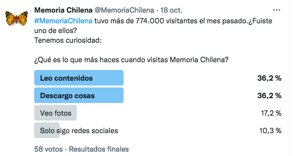 Para conocer las prácticas de quienes visitan Memoria Chilena desde redes sociales, preguntamos el 18 de octubre: ¿qué es lo que más haces cuando visitas Memoria Chilena? Hubo un empate en las dos mayorías: un 36,2% de los seguidores de Twitter que participaron dijo leer contenidos, mientras que otro 36,2% declaró que descargaba cosas. Más atrás, con un 17,2%, fue votado "veo fotos" y una minoría, 10,3%, sostuvo que solo seguía la cuenta por redes sociales y no usaba la web.