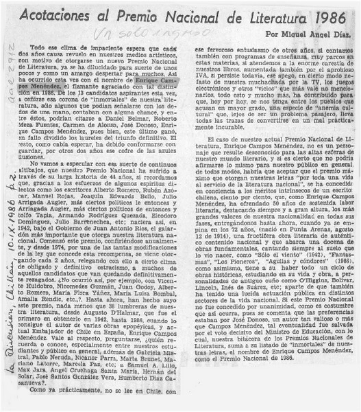 Acotaciones al Premio Nacional de Literatura 1986 [artículo] Miguel Angel Díaz.