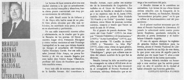 Braulio Arenas Carvajal Premio Nacional de Literatura [artículo] Gustavo Rivera Flores.