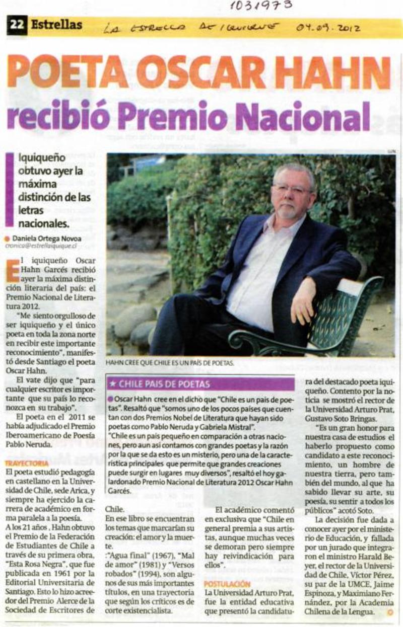 Poeta Oscar Hahn recibió Premio Nacional [artículo]