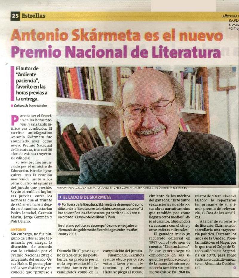 Antonio Skármeta es el nuevo premio nacional de literatura. [artículo]