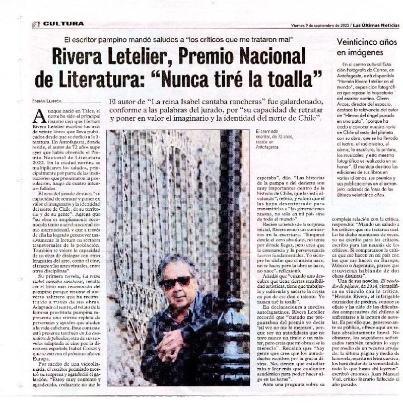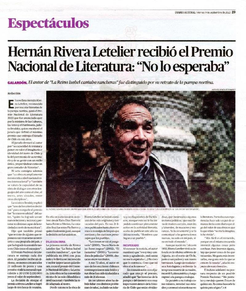 Hernán Rivera Letelier recibe Premio Nacional de Literatura 2022 [artículo].