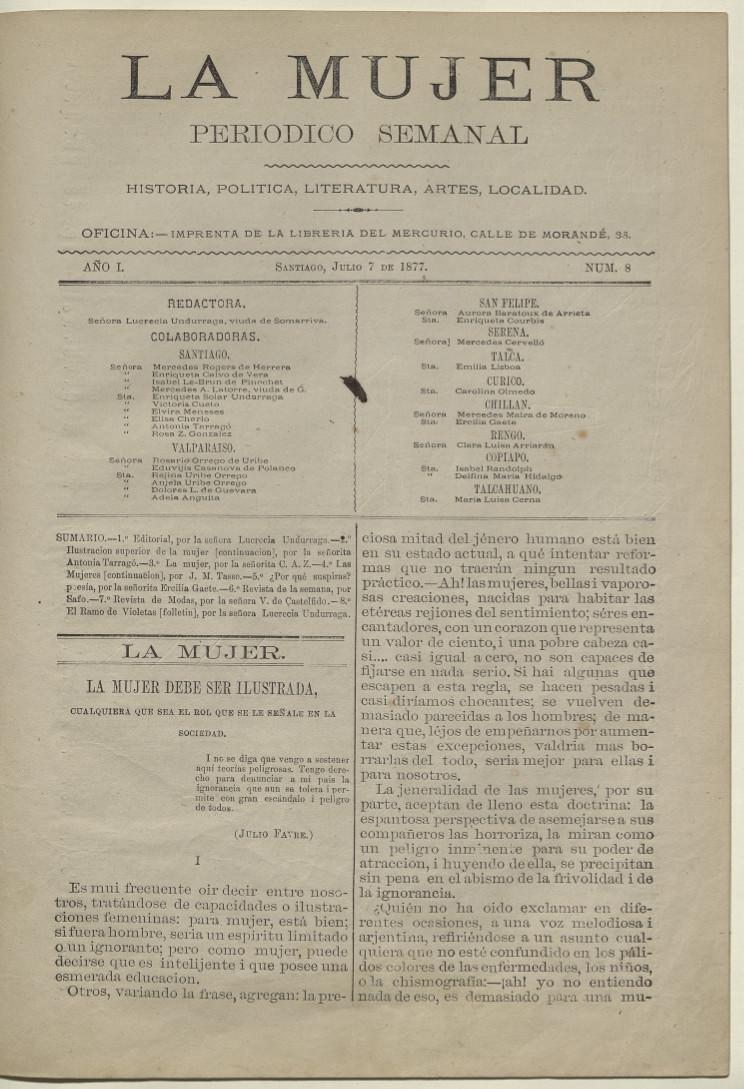 A fines del siglo XIX, y en el contexto de la promulgación del decreto Amunátegui que oficializaba el ingreso de las mujeres a los estudios superiores, apareció el periódico semanal político-literario La Mujer. Lucrecia Undurraga, su directora, propuso un medio de comunicación escrito por mujeres y orientado a estas. Este periódico es presentado por Memoria Chilena dentro de un nuevo minisitio en el que se incluyen las digitalizaciones de todos los ejemplares de la revista que están disponibles en la Biblioteca Nacional, así como cápsulas acerca de autoras que participaron de la publicación, y sobre las diferentes secciones de La Mujer.