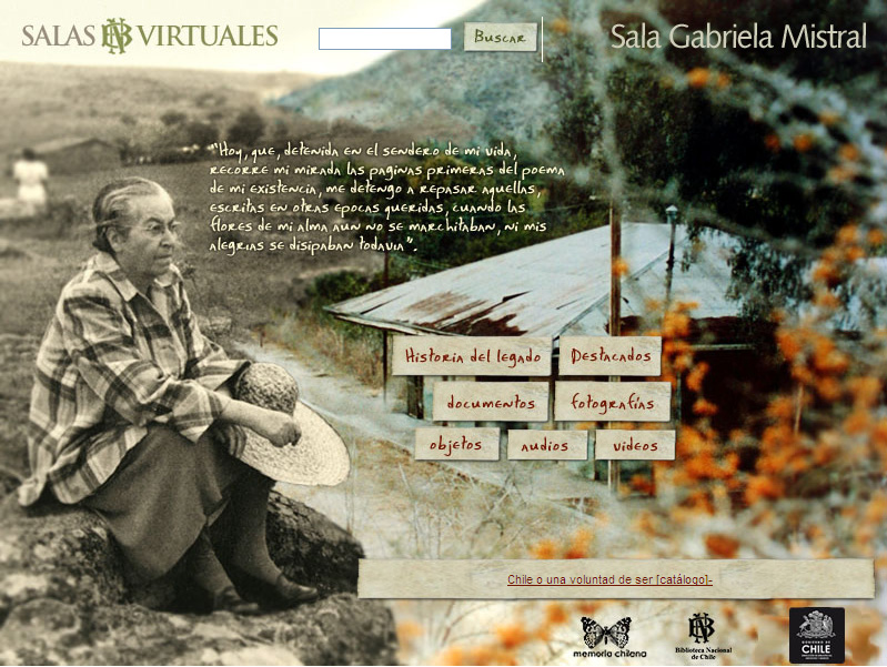 En 2005, con la nueva plataforma de Memoria Chilena se inaugura la sección Salas Virtuales. Es un primer antecedente de los contenidos que hoy se presentan en Biblioteca Nacional Digital. En la imagen, la Sala Virtual Gabriela Mistral, que albergó material digitalizdo del legado de la autora que fue recibido por la Biblioteca Nacional en 2007.