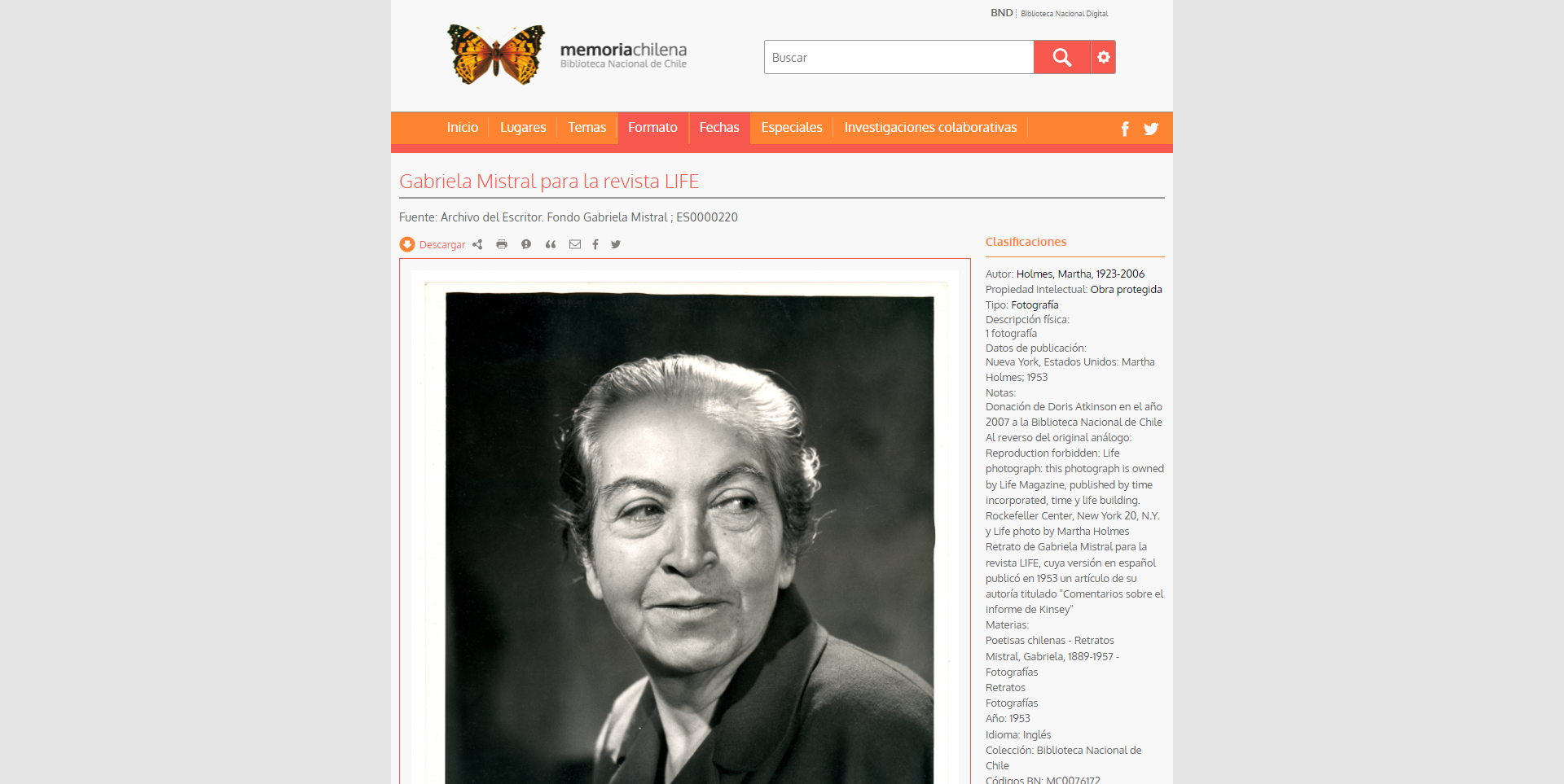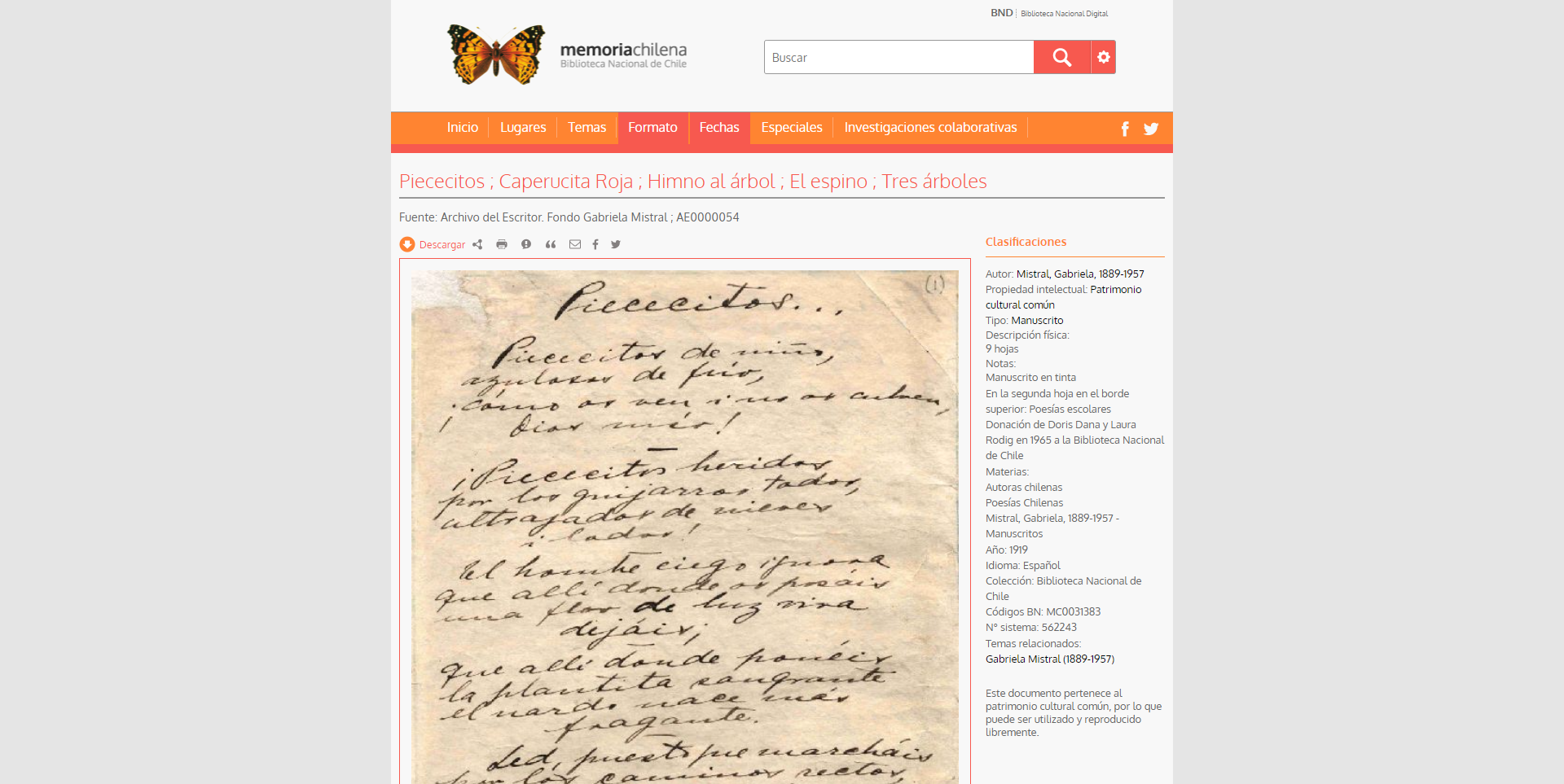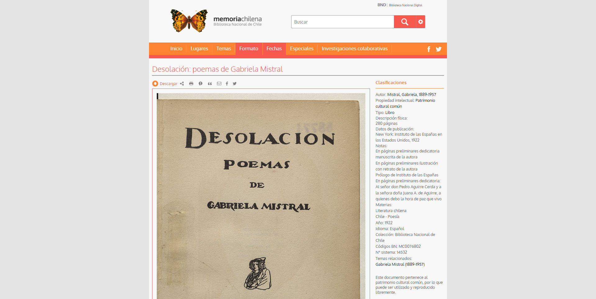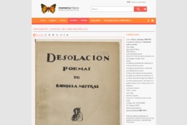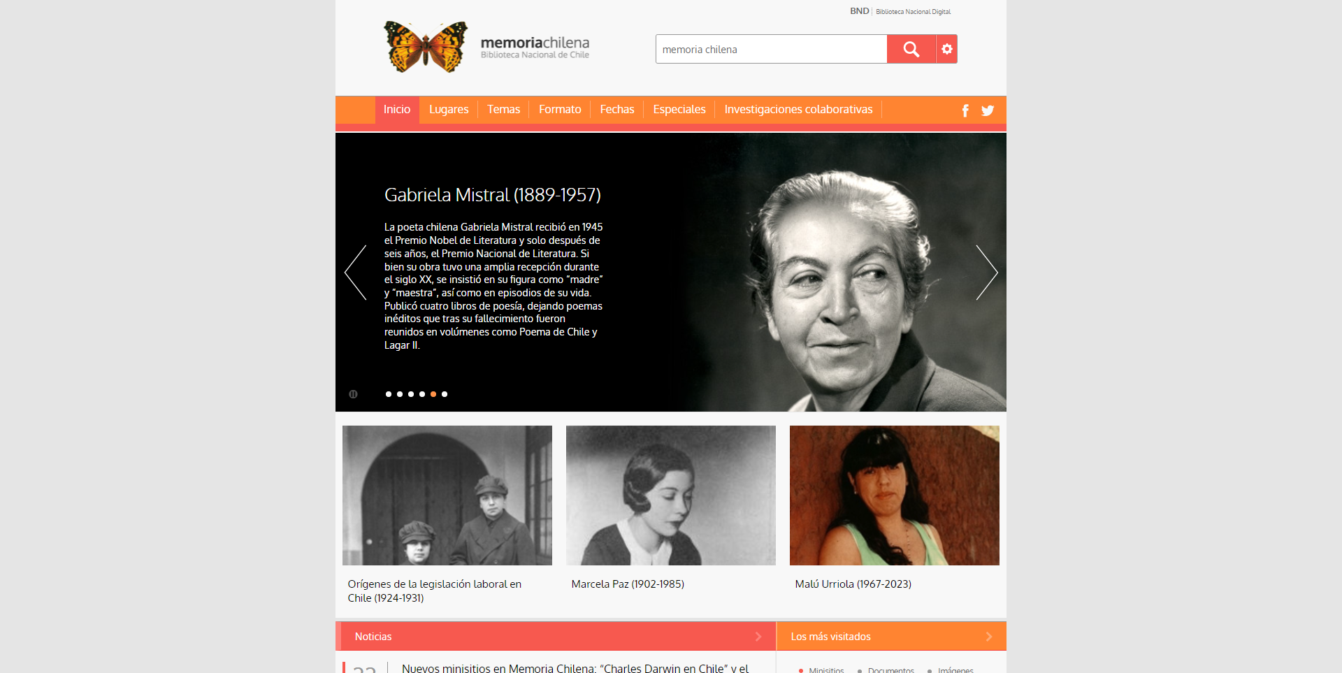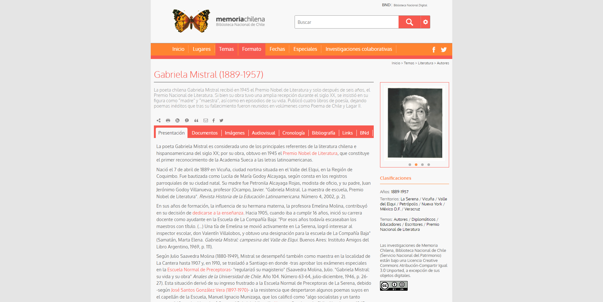 El minisitio actual de Gabriela Mistral en Memoria Chilena. En 2023 se realizó una nueva investigación en torno a la autora y se incorporaron nuevos documentos, entre ellos, la digitalización de las primeras ediciones de la escritora.