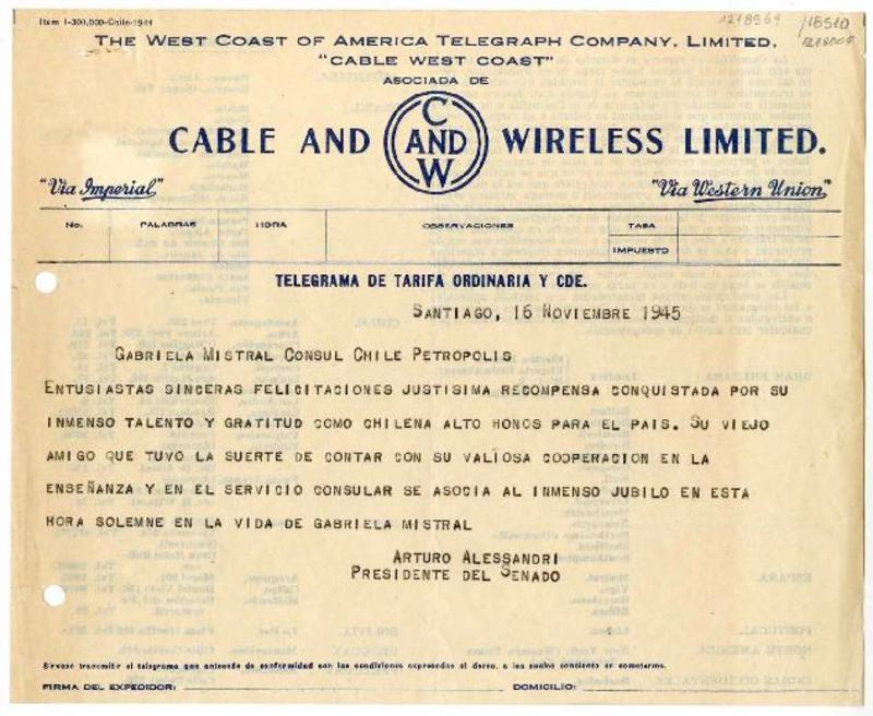 Santiago, Chile [a] Gabriela Mistral, Petrópolis, Brasil Telegrama, 1945 noviembre 16, [manuscrito] Arturo Alessandri Palma. Pablo Neruda y Camilo José Cela en Isla Negra [fotografía].