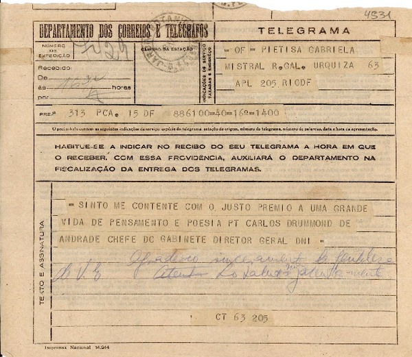 [Telegrama] 1945 nov. 16, Brasil [a] Gabriela Mistral, Rio DF, [Brasil] [manuscrito] Carlos Drummond de Andrade.